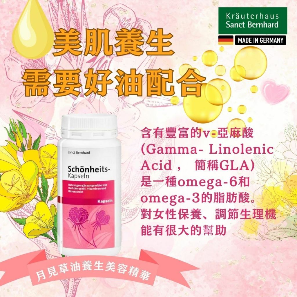 Sanct Berhnard 德國月見草美容膠囊經科學配比,主要功效是為女性由內而外養護皮膚、頭髮和指甲,調節女性生理機能,緩解經期和更年期不適,並提供必需脂肪酸,幫助維持整體健康與新陳代謝,特別適合關注肌膚彈性、髮質與女性荷爾蒙平衡的人士。